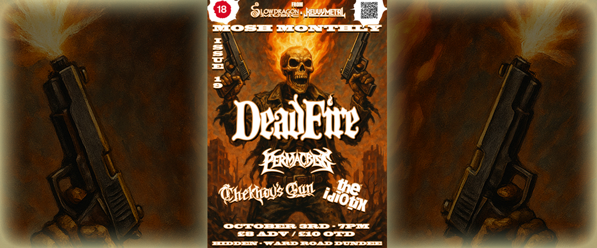 For the first of this new batch, we welcome back the utterly storming Deadfire. Filthy hard riffing and a buzzing stage makes them a solid leader, for a bill that also includes young thrashers, Permacrisis, increasingly esoteric extreme metal troupe, Chekhov’s Gun, and Inverness lunatics, The Idiotix. This is a start to the season we are very pleased with!